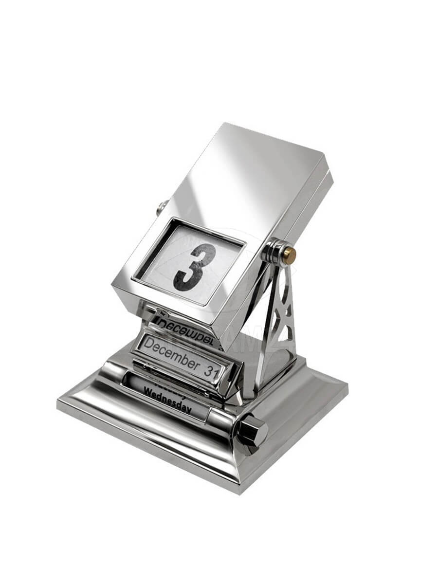 В основании календаря установлен металлический валик с наклеенными днями недели, а также пластиковая рёберная ручка, позволяющая удобно вращать валик для изменения даты. Корпус изготовлен из прочного цинкового сплава. Вставки в календаре выполнены на русском языке.