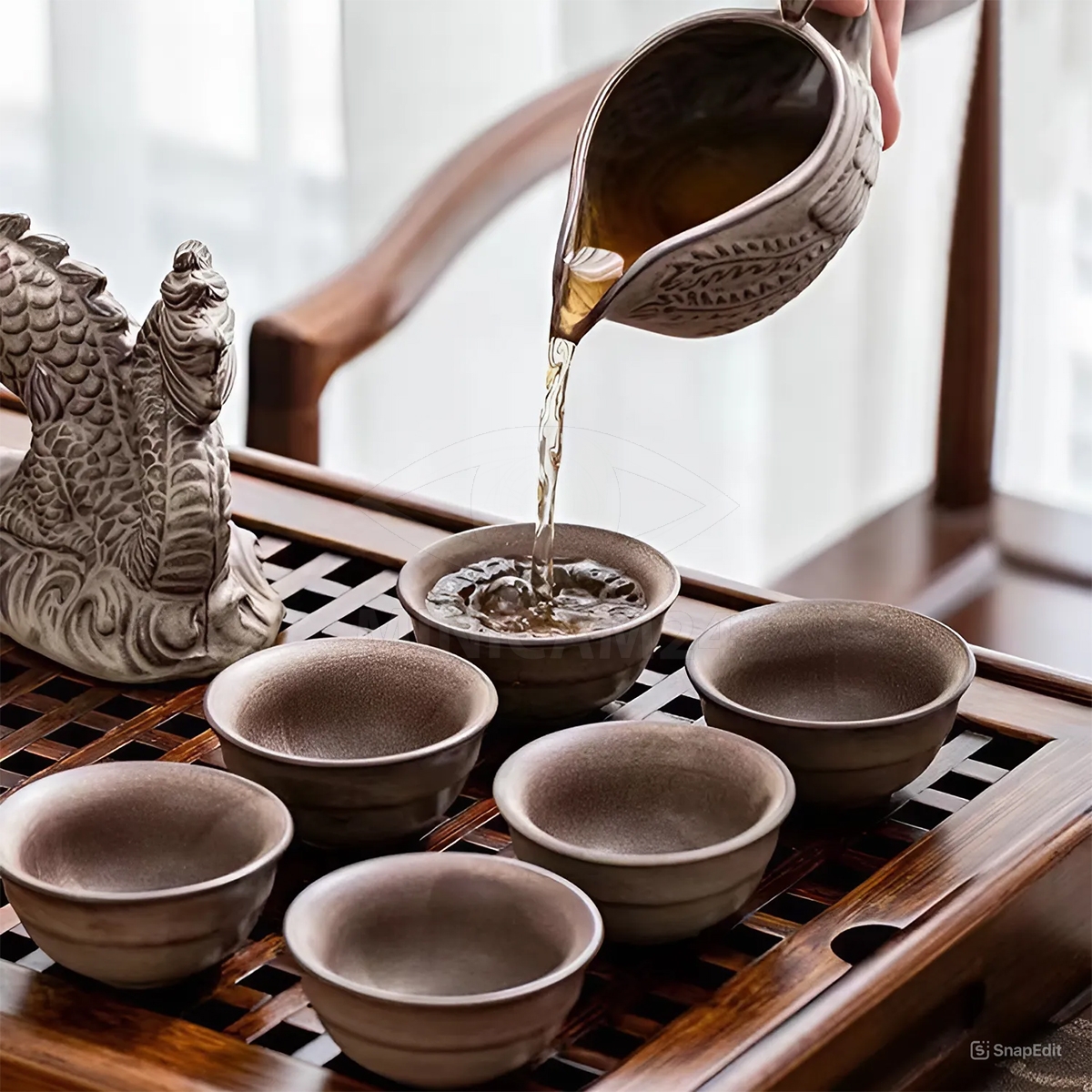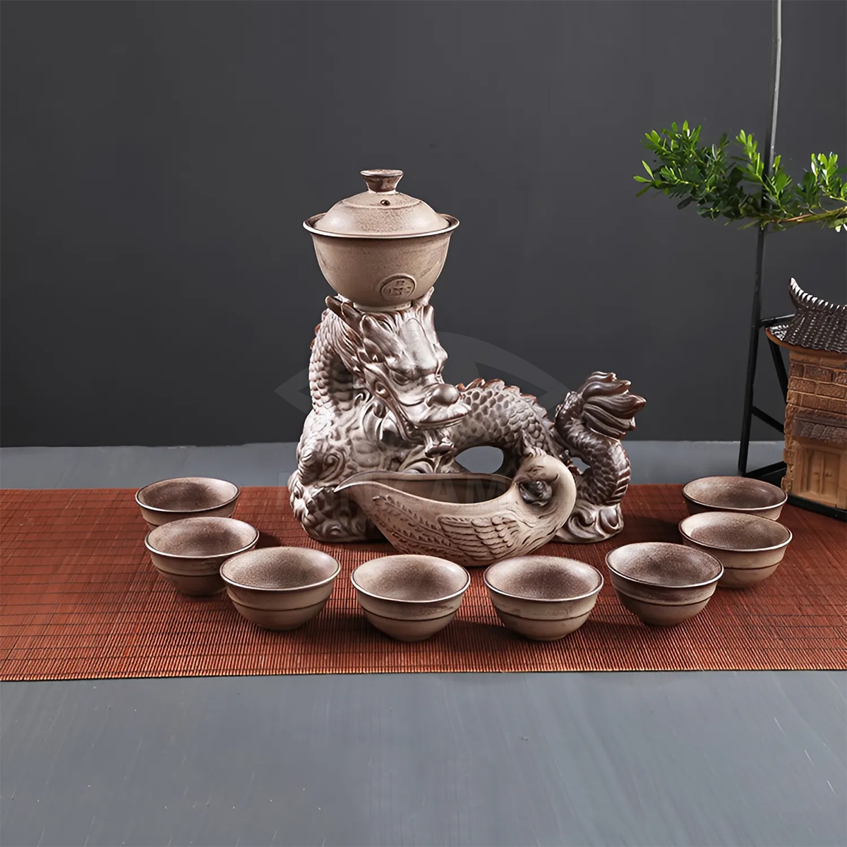 В набор также входят 8 пиал объемом 45 мл каждая, которые позволяют насладиться чайными напитками в кругу семьи или друзей. Пиалы выполнены из прочной керамики и отличаются элегантным дизайном. Для удобства сервировки в комплекте предусмотрена подставка размером 23х17,5 см, которая служит основой для размещения чайных аксессуаров, а также добавляет эстетичности и завершенности процессу чаепития.